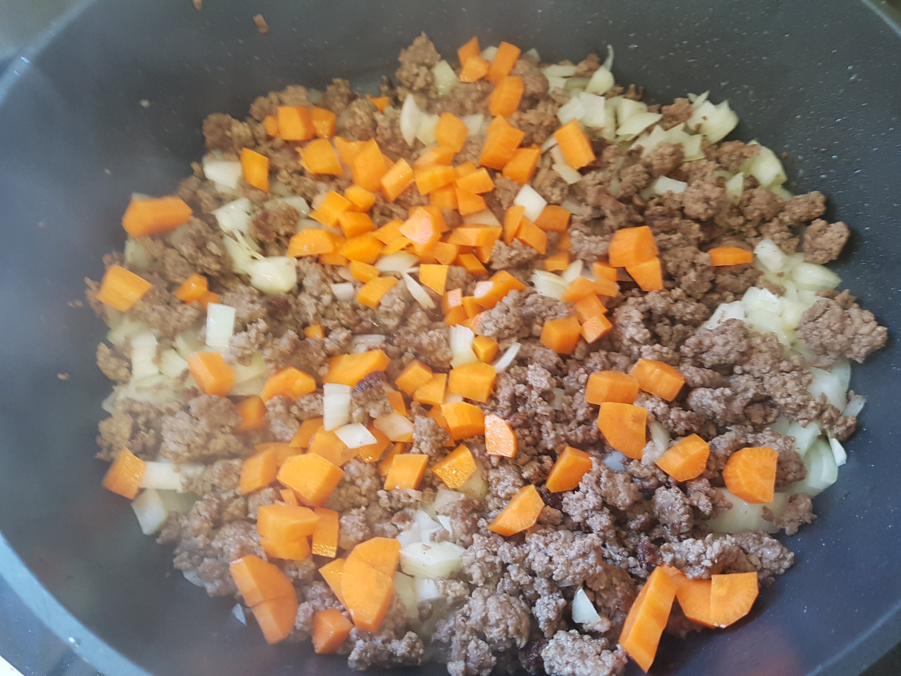 מטגנים בנפרד בצל ומוסיפים אליו בשר וגזר.