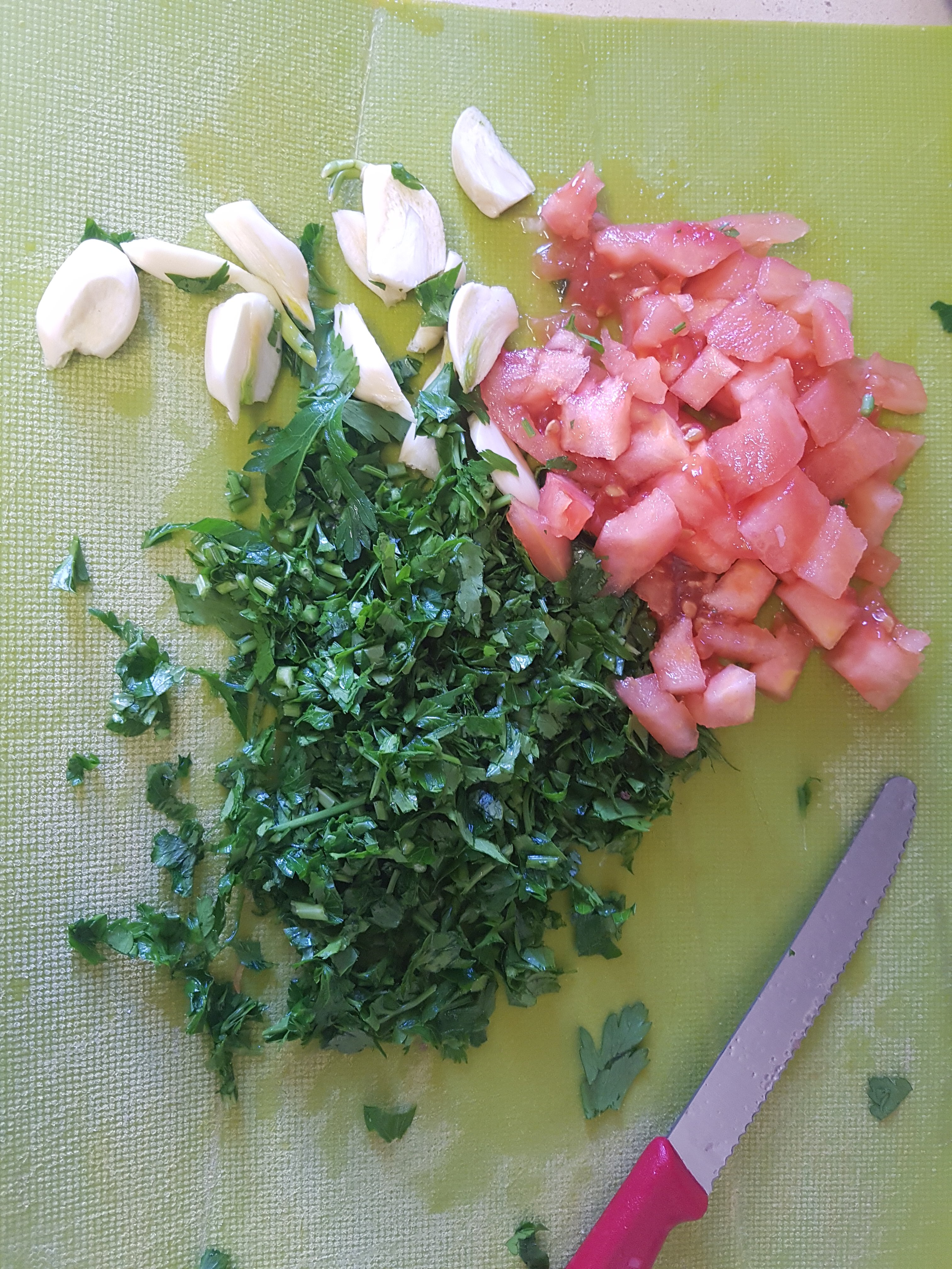 מוסיפים עגבניות, פטרוזיליה ושום לתבשיל.