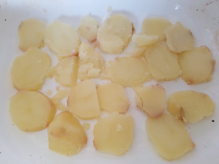 מבשלים תפוחי אדמה ופורסים אותם לעיגולים.