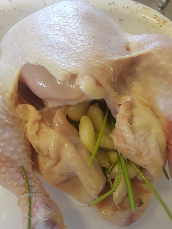 למדתי מהמתכון הזה המון: איך לקלף כמויות גדולות של שום (לבשל 5 דק במים רותחים), שצריך להתחיל לאפות את העוף על החזה (הגיוני ביותר כי הוא לא נוגע בכל הנוזל שמצטבר על המגש וכך לא מתבשל אלה נאפה), שהיין והברנדי דווקא הולכים טוב ביחד ו….איך לא חשבתי על זה קודם – לדחוס את כל התבלינים והשום בתוך העוף.