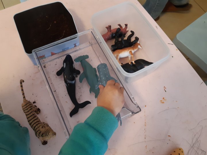 משחק ים- יבשה בו ממיינים חיות לים (מים בקערה) ויבשה (אדמה מעציץ)