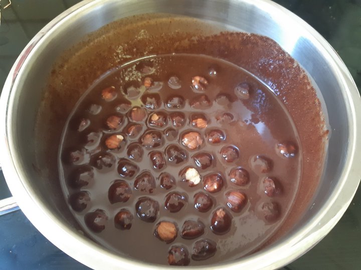 כשכל העיסה הופכת להיות נוזלית, מוסיפים כפית של אמרטו ואת אגוזי הלוז (כמות שאוהבים). מערבבים ומכבים את האש.