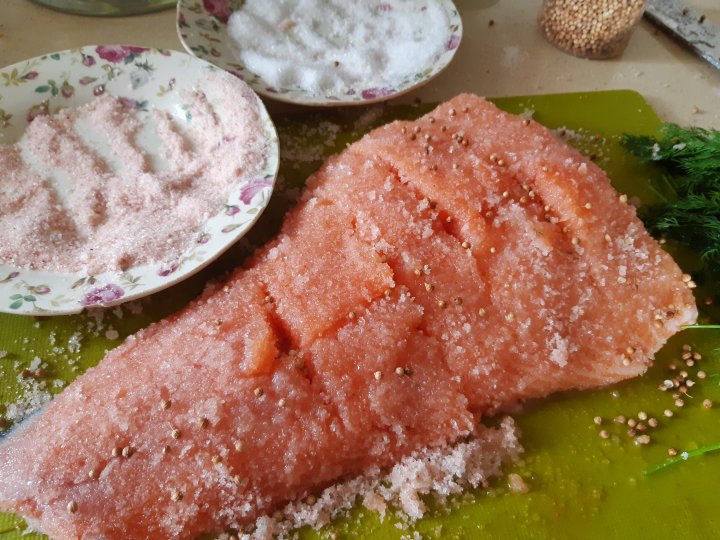 מכסים את הפילה בשכבת סוכר ולאחר מכן, בשכבה נוספת של מלח. כמות הסוכר, במתכון זה שווה לכמות המלח. חשוב לכסות את כל הדג, מלמעלה ובצדדים, בלי להשאיר "חורים".
