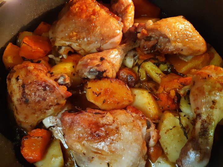 1. שמים את העוף והירקות בסיר שמתאים לתנור.