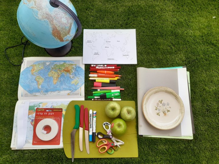 כדי להמחיש לילדות איך מכדור הארץ יוצרים מפה (שתי חצי ספרות), ביקשתי מהן לצייר את היבשות על התפוח. אחרי שהילדות ציירו את היבשות, חתכנו אותו כדי ליצור את שתי חציי הספרות.