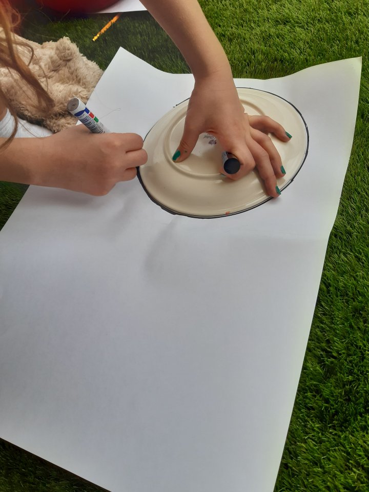 ציירנו, באמצעות צלחת, שני עיגולים על דף A3 וחתכנו אותם. כך קיבלנו את שתי חציי הספרות.