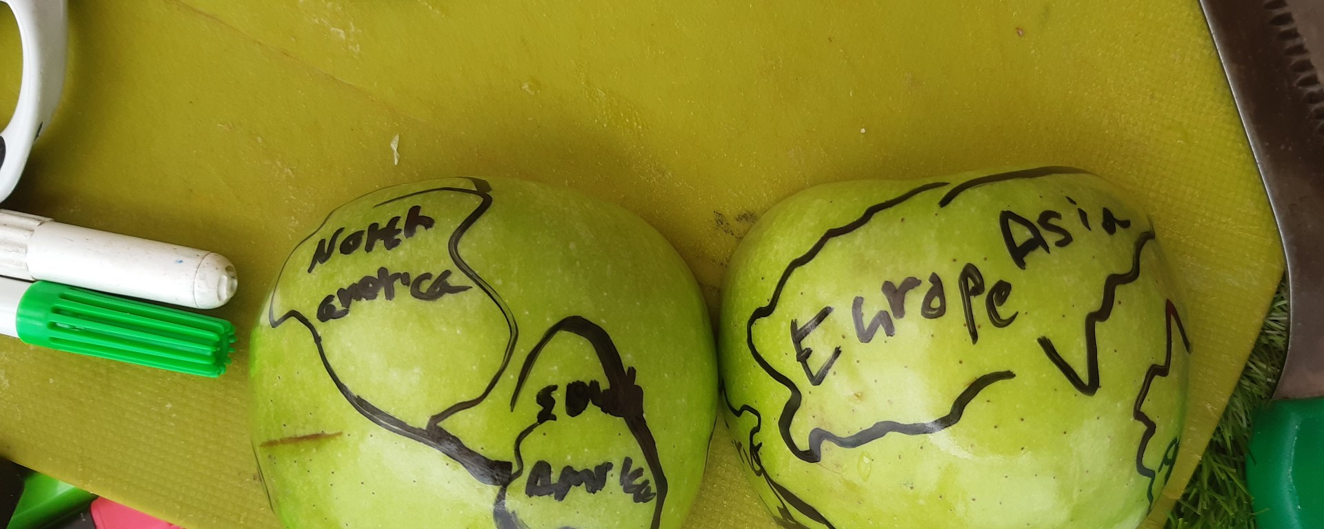 כדי להמחיש לילדות איך מכדור הארץ יוצרים מפה (שתי חצי ספרות), ביקשתי מהן לצייר את היבשות על התפוח. אחרי שהילדות ציירו את היבשות, חתכנו אותו כדי ליצור את שתי חציי הספרות.