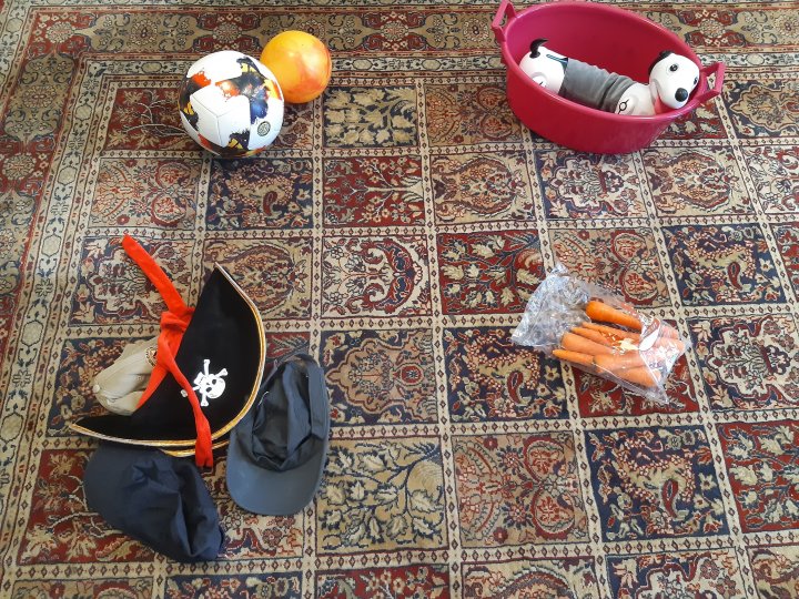 קודם כל, אני מבקשת מהילדים, להביא את האביזרים הקשורים לשיעור, לדוגמא: חתול, כלב, גיגית, גזרים, כובעים: bring me a hat, where is a tub? , put the hats on the carpet,…. – הם מביאים את כל הדברים שאנחנו הולכים לראות בסרט.