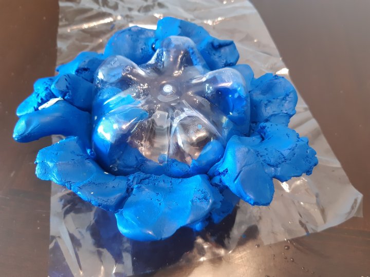 מכינים את הר הגעש: חותכים בקבוק קולה ומשאירים את החלק התחתון. מרפדים אותו בפלסטלינה.