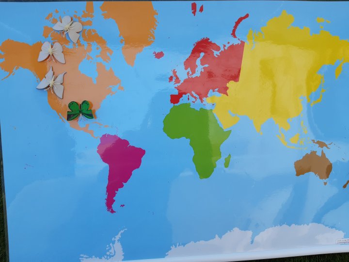 ביקשתי מבתי להראות לי על המפה המונטסורית את היבשת צפון אמריקה. הראתי לה איפה בערך נמצאת קנדה, אלסקה וצפון ארצות הברית ומשם את מסלול הנדידה למקסיקו.