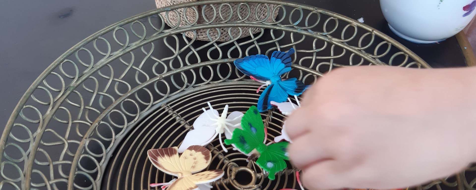 ביקשתי מבתי הקטנה לבחור פרפר שרוצה לאכול ולתת לו צוף מהצמח שבעציץ. היא שיתפה פעולה בשמחה.