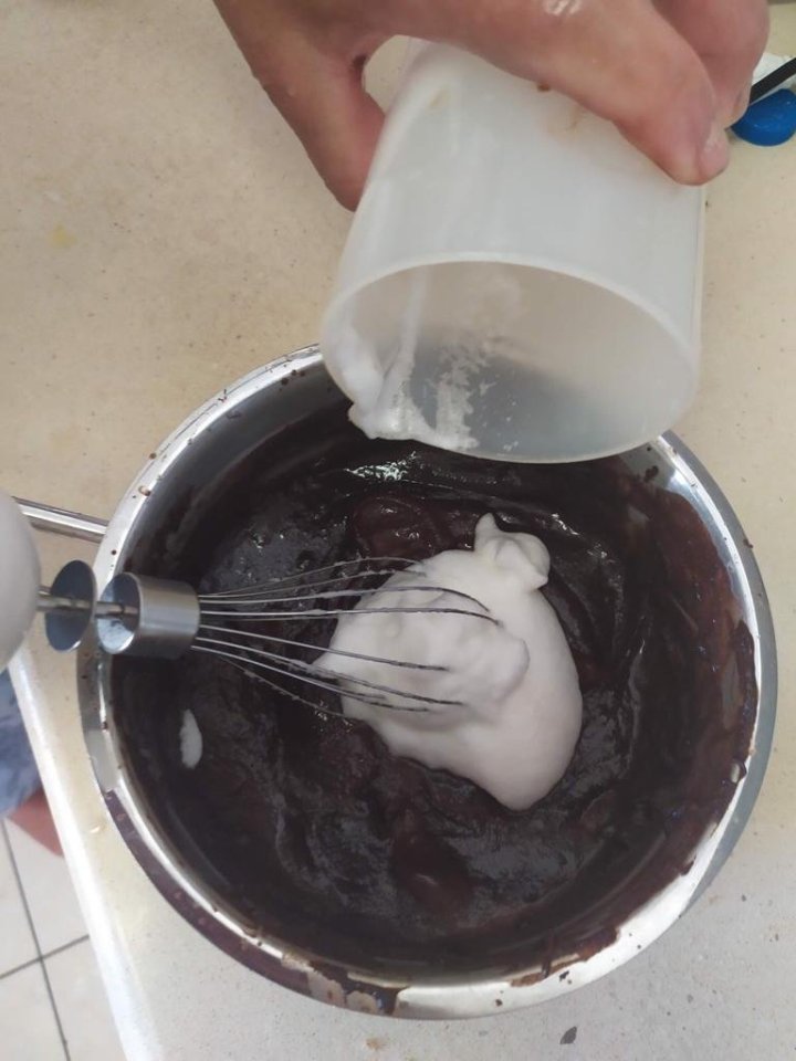 מוסיפים את החלמונים ואת האינסטנט פודינג שוקולד לתערובת החלבונים, ומערבלים.