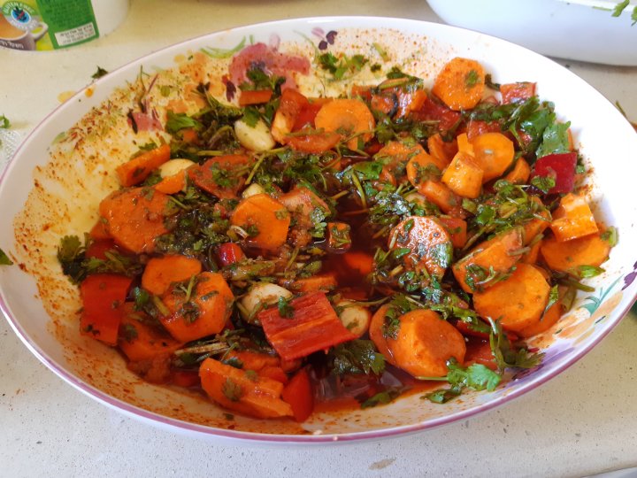 מלבד הדג, לערבב בקערה את כל הירקות שהכננו.