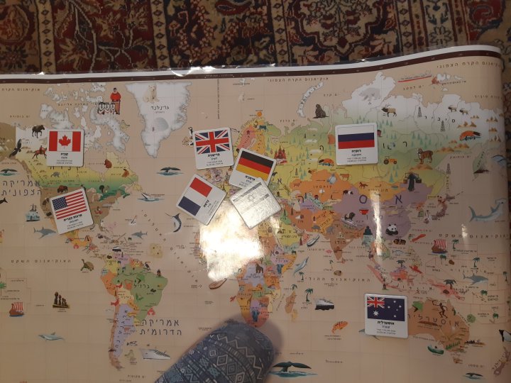 המשכנו לשחק והצבעתי לה על המפה איפה היא צריכה להניח כל דגל. הראתי לה גם מאפיינים של אותה המדינה, לדוגמא – תמונה של המלכה בבריטניה.