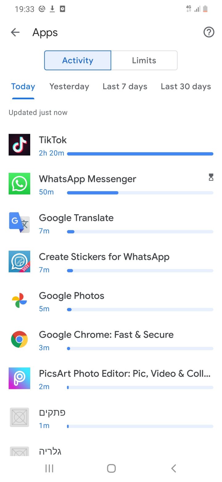 – לראות כמה זמן היא משתמשת בכל אפליקציה שמותקנת בטלפון שלה, לדוגמא – היא השתמשה שלוש שעות בוואטסאפ.