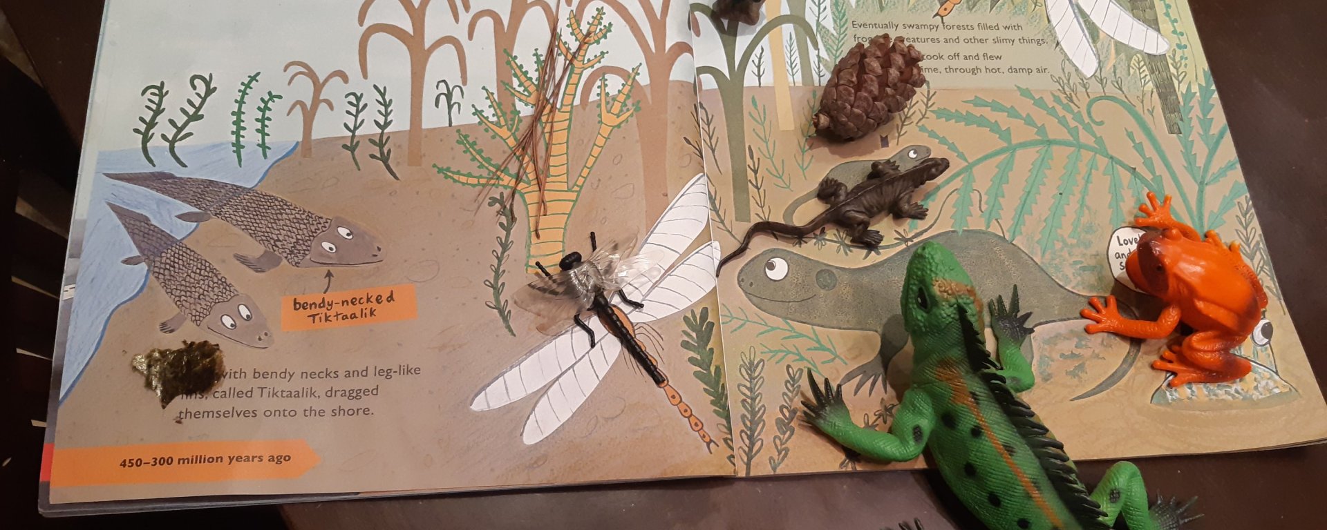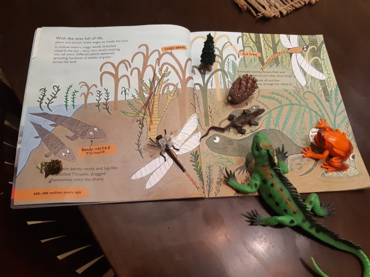 שימו לב, שהספר כתוב בצורה דרמטית וזה בדיוק מה שמושך את הילדים. אל תוותרו על להכניס דרמה לסיפור שלכם – ״ בהתחלה, כדור הארץ היה מקום חם ורועש, וגז מחניק נפלט מהרי הגעש״. כדאי להשתמש בכל התארים האלו כדי להעביר לילד את האווירה ששררה באותה התקופה ולהרשים אותו.