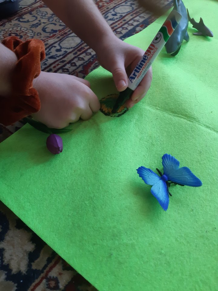 אם היו חסרות לי חיות, הדפסתי אותן, עשיתי למינציה לדפים המודפסים, גזרתי את החיה והדבקתי מאחור סקוטש דו צדדי: