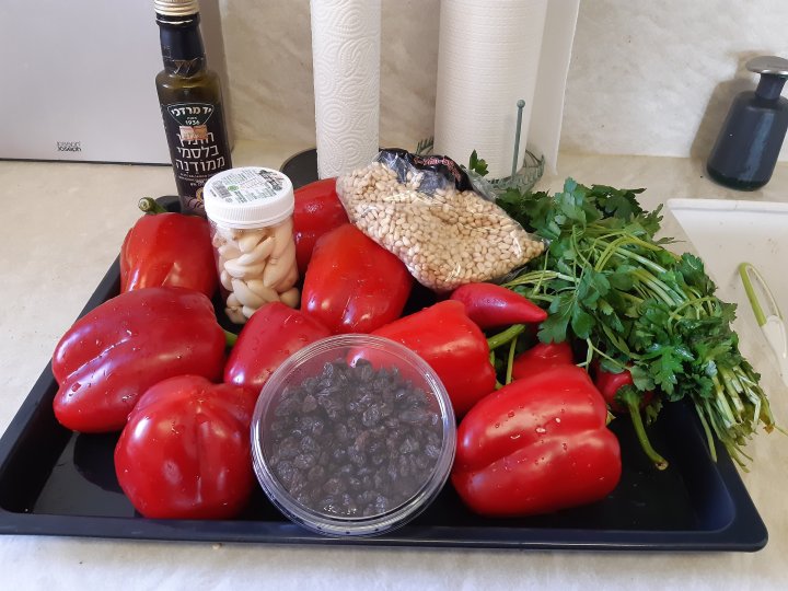 לאותה הקערה, עם הפלפלים, מוסיפים את התערובת של הצימוקים, הצנוברים והפטרוזיליה.