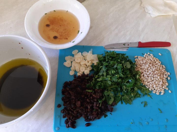 מעבירים את השום, הפטרוזיליה והצימוקים לקערה.