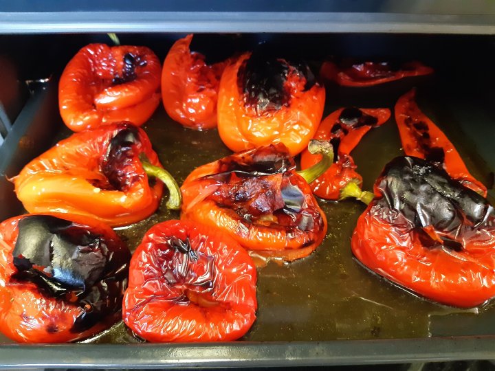 מוציאים את הפלפלים מהתנור.
