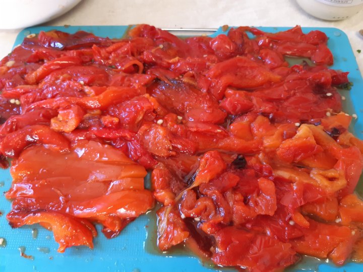 מוסיפים את הפלפלים לקערה עם החומץ והשמן זית.
