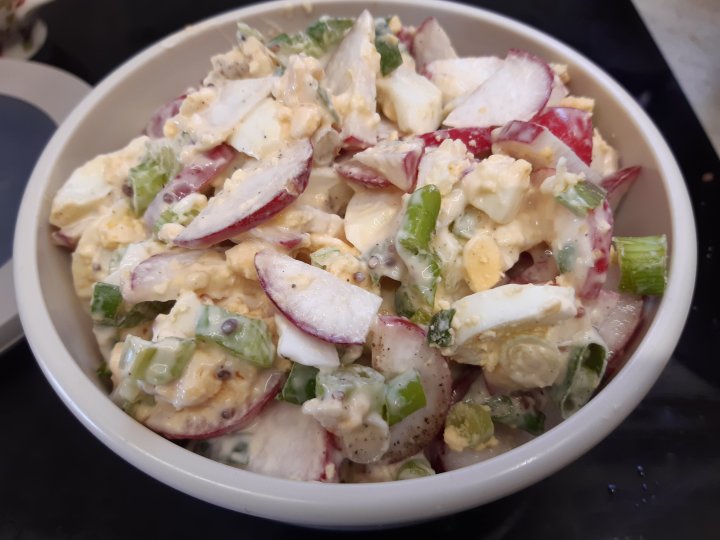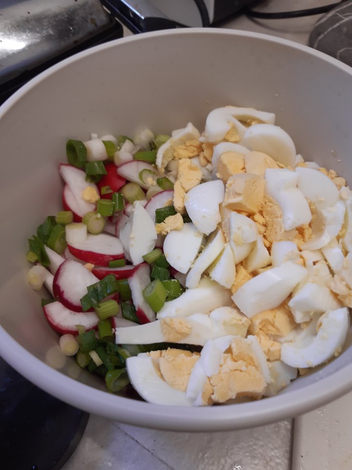 מניחים את הצנוניות, הבצלים והביצים בקערה.