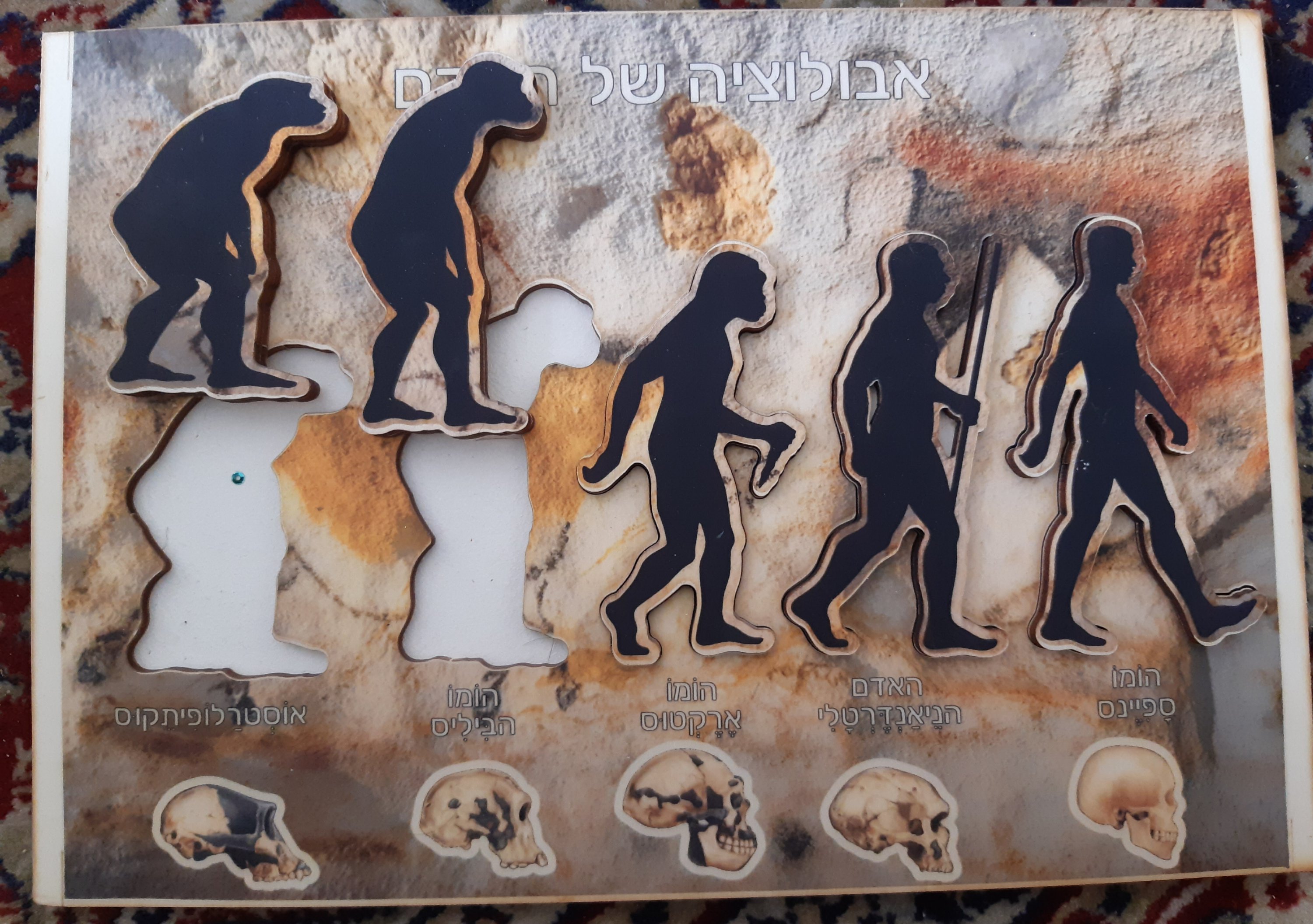כדי להכין את הבנות קצת לביקור, שלפתי שוב את הפאזל "אבולוציית בני האדם" ואת הבובות של חברת הספארי, וסיפרתי להן שהן הולכות לראות את המקום "איפה שגרו הבני האדם הקדמונים" – הומו ארקטוס, נאנדרטלי והומו סאפיאנס. שיחקנו שוב בפאזל.