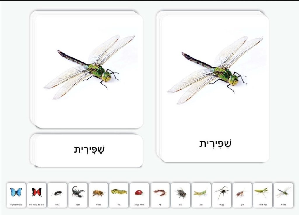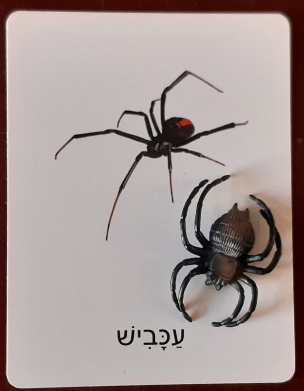 אפשר להתאים חזותית בין התמונה שבכרטיסייה לצעצוע תואם- לדוגמא, בין חיה "אמיתית" (עקרב) לכרטיסייה בה תמונה של עקרב: