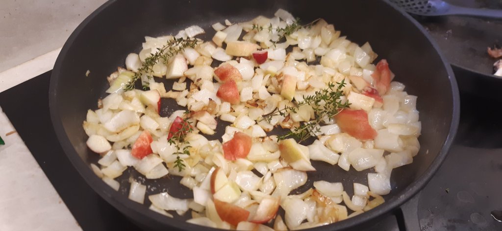 שמים סיר רחב מאוד על האש. מטגנים בו את הבצל עד שהוא משחים והופך להיות מקורמל. מכבים את האש. מפזרים מעל הבצל: את המשמשים (חצי ראשון מהכמות), מלח, ענפי הטימין, ומניחים שני ראשי שום.