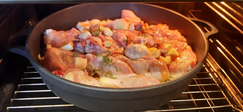 בשלב ראשון, משאירים את הסיר פתוח ואופים בחום 215° (כשהעצם של העוף למעלה), במשך רבע שעה.