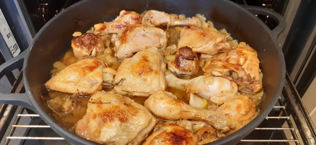 הסוד של העוף הזה הוא בכמויות מטורפות של בצל וגם, כמובן, באלכוהול המלווה אותו. ואל תדאגו, אף אחד לא ירגיש את הטעם של האלכוהול, בגלל שהוא מתאדה לגמרי (אבל משאיר טעם מיוחד לעוף). הילדים שלי ממש אהבו את העוף.