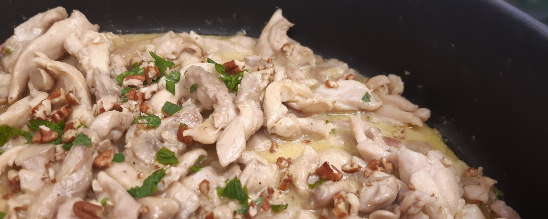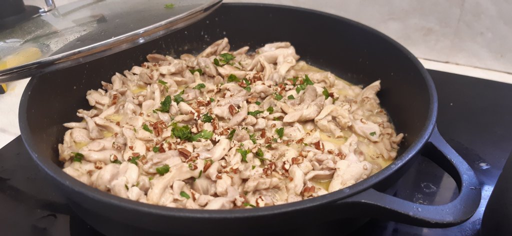 מקשטים את העוף עם כוסברה קצוצה ופלפל אדום חריף, פרוס דק (אפשר לוותר). אני קישטתי גם עם אגוזים, אבל היום הייתי מוותרת על זה.