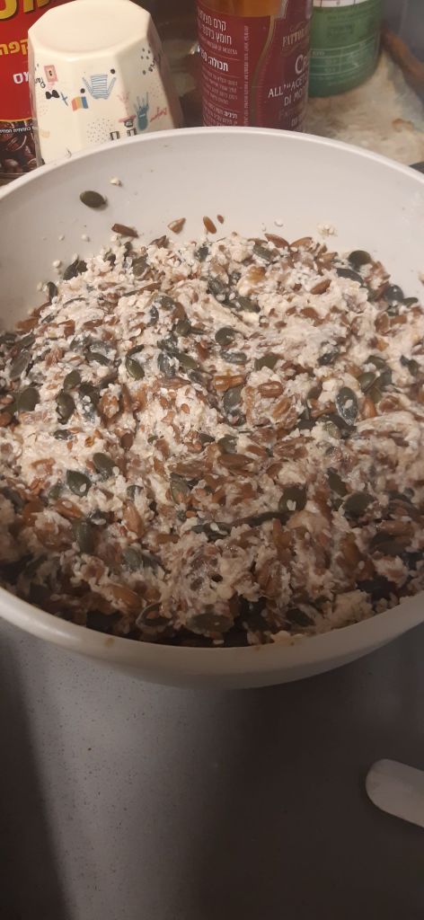 הערה: אני שמתי את הבלילה בצד לכשעה. השלב הזה חשוב גם כי אחר כך הגרעינים והאגוזים סופגים מים וזה מקל על העיכול.