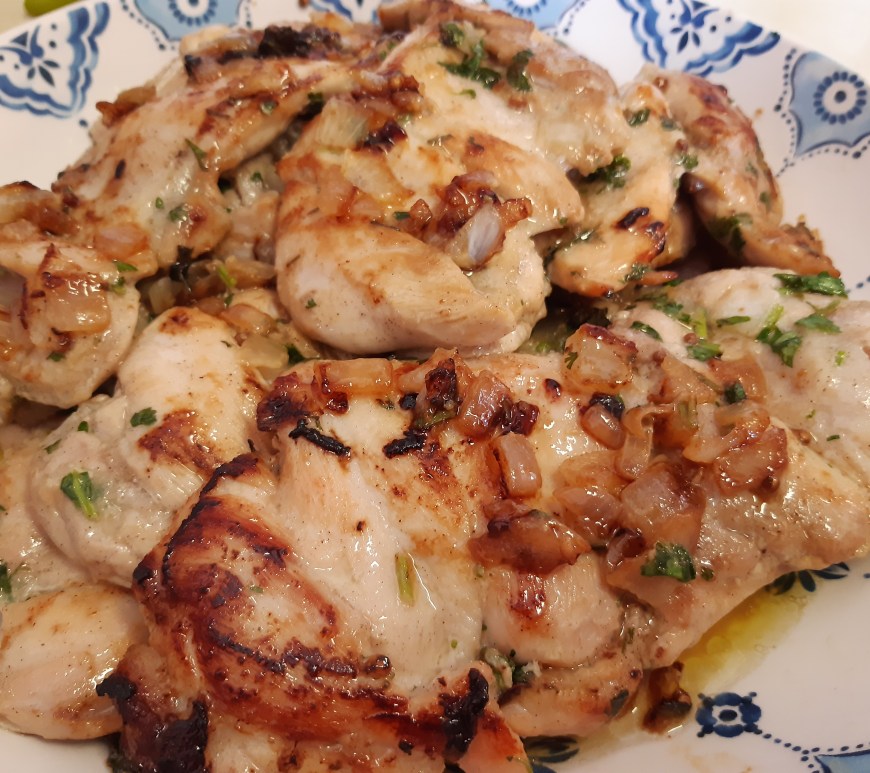 סטייק פרגית עם כוסברה, בצל וסירופ מייפל, על המחבת